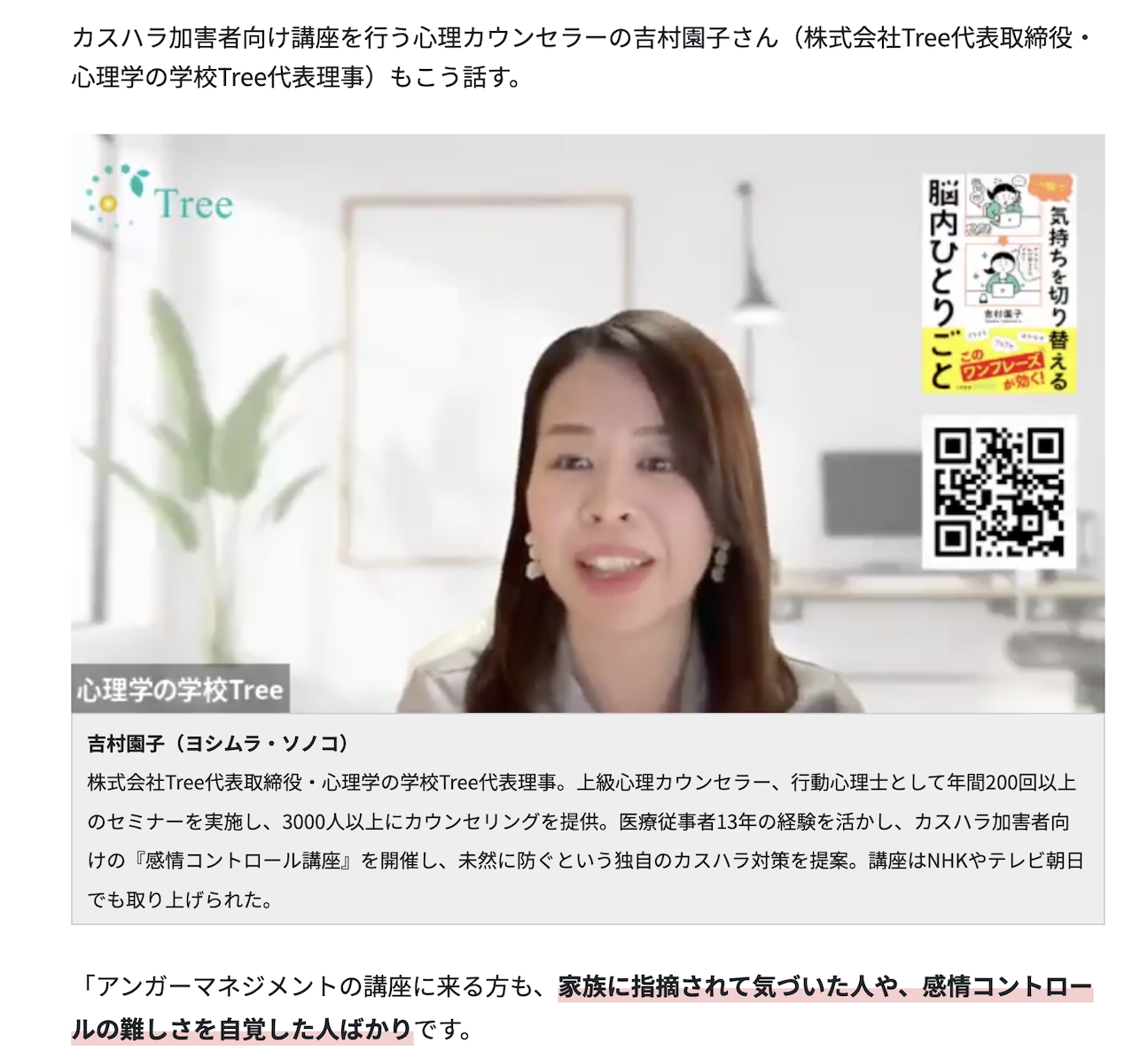 2025.10.19 リディラバジャーナル様の特集記事が公開されました! \リディラバジャーナル様の特集記事が公開されました!/ 構造化特集「カスタマーハラスメント~企業を追い詰める『お客様』たち〜」 第5回の記事が公開されました! 私は今回で3回目の取材協力です。 行政のカスハラ対策に焦点をあてています。 条例や法改正など、取り組みは進む一方で、 「顧客の権利を守る」ことと「職員の安全を守る」ことの バランスに悩む現場の葛藤も見えてきました。 厚労省や東京都の事例を通して、 “対策のむずかしさ”を考える回です。 よかったら、ぜひ記事をチェックしてみてください。 心理学の学校Tree 代表理事 吉村園子 リディラバジャーナル様の記事を見る ※2025年10月22日まで無料 もしよろしければご共有等でご活用いただけると幸いです。 企業を追い詰める「お客様」たちについて 特集のイントロにあたるこちらの記事は、無期限で無料公開 JAいるま野様でカスハラ未然防止研修前の記事
